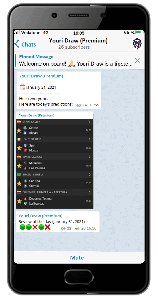 Il existe deux chaînes Telegram. Une gratuite, avec des pronostics chaque lundi, et une Premium, accessible uniquement aux membres premiums.